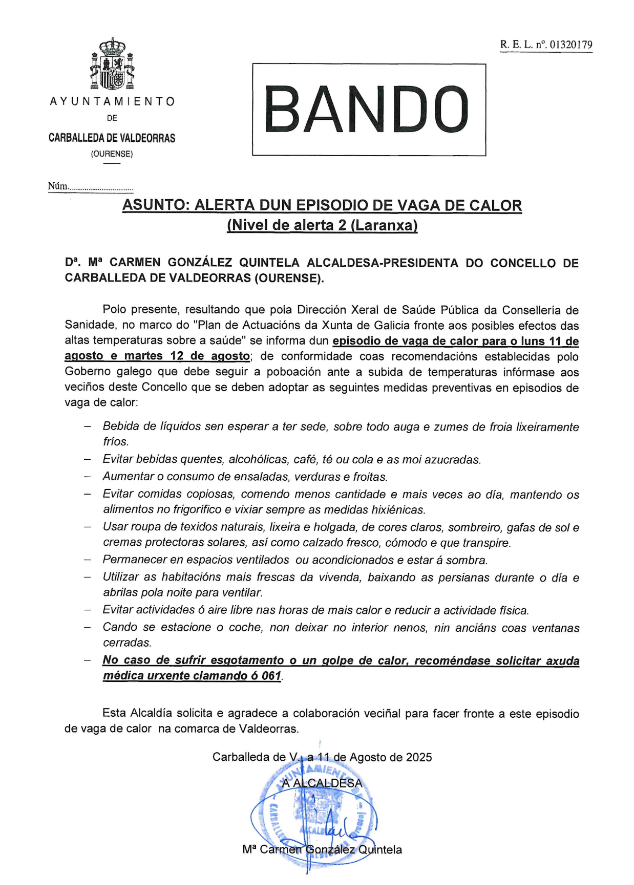 BANDO – Alerta de un episodio de ola de calor – Nivel de alerta 2 (Naranja) Publicada el agosto 12, 2025agosto 13, 2025 por Concello