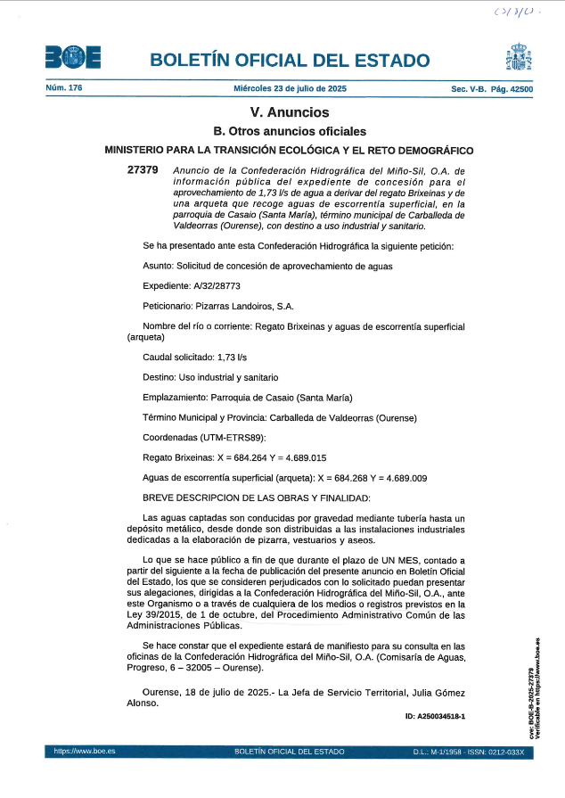 Anuncio de la Confederación Hidrográfica del Miño-Sil de información pública del expediente de concesión para el aprovechamiento de 1,73 l/sg de agua a derivar del regato Brixeinas y de una arqueta que recoge aguas escorrentía superficial, en la parroquia de Casaio (Santa Maria), término municipal de Carballeda de Valdeorras (Ourense), con destino a uso industrial y sanitario